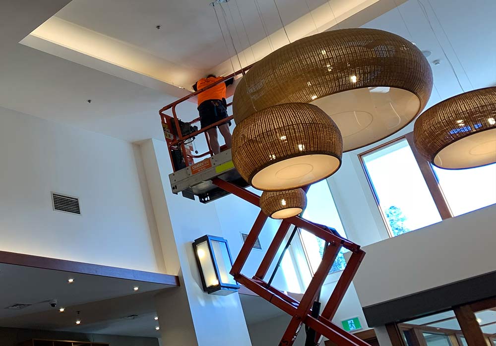 Our accomplishments in the front foyer were completed deftly on a 24-hour schedule. The works implemented by our team required working at heights suspension (over 8-metres high in a heavily trafficked area), and meticulous attention to protecting chic floor and wall surface areas. Minimal disruption to trade, noise avoidance, and definitive safety measures were imperative at all times.